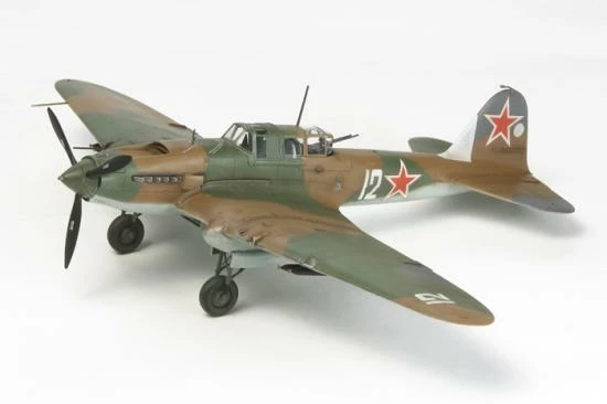 The Ilyushin Il-2 Shuturmovik was the Russian military s representative ground-attack aircraft during WWII. Over 36,000 examples were built by the end of the war, making it the most produced military aircraft in aviation history. The aircraft was characterized by armor that was integrated into its airframe to provide protection for vital areas such as the cockpit, engine, and fuel tank. Production of the single-seat version of the Il-2 began in March 1941 but severe losses led to the development of a two-seat version with a rear gunner. A version which featured outer wing sections swept back at 15 degrees for a better center of gravity was introduced in late- 1943. Together with the T-34 tank, the Il-2 contributed greatly to the eventual Russian victory.The Tamiya 1/72 aircraft model faithfully captures all the details of this historic aircraft. The Il2 is also available in 1/48 scale for those modelers who have extra display space in their war bird collection.