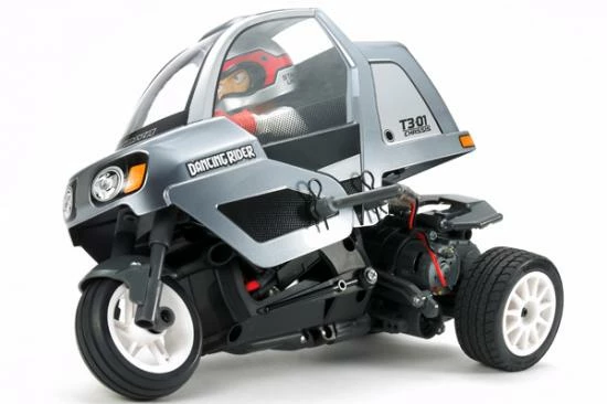This R/C model assembly kit creates the Dancing Rider, a supremely fun 3-wheeled model that offers an exciting lean when cornering. An original body is included with the kit, and was designed under the supervision of famed Japanese artist Atsushi Arino. It is molded in lightweight polycarbonate, and comes with a molded driver figure for an extra touch of fun.