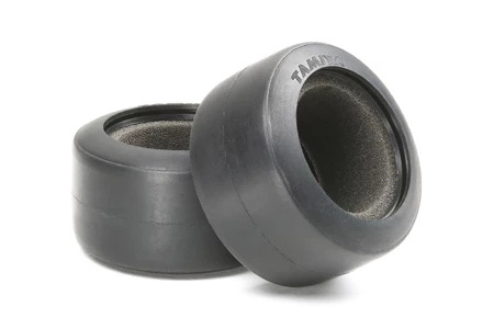 These are the kit supplied replacement rear rubber tires for the F104 chassis. They come belted and work best in track temperatures exceeding 95 degrees. As track temperatures drop below 95 degrees grip levels drop accordingly.
