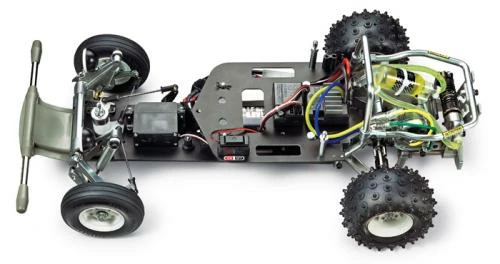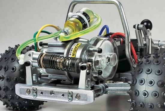 Tamiya is delighted to welcome the Fighting Buggy back to its product line-up with this re-release version of the 1982 R/C buggy classic. It retains the unique suspension and drivetrain setups employed on the original model and pairs them with a newly-designed chassis. The ABS resin body keeps the shape and design theme from its predecessor, accenting it with updated markings. It is equipped with an aluminum roof wing part and side nets for an authentic buggy-esque look.