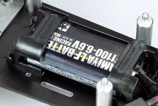 The separately sold Tamiya LF Battery LF1100-6.6V Racing Pack (M-Size) can be fitted snugly in the area underneath the upper deck.