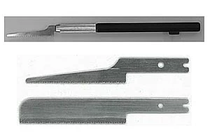 This handy tool is perfect for modifying plastic models or Mini 4WD machines, as well as woodcraft. Its blades are slightly thicker than Item 74018 Mini Razor Saw and therefore less prone to distortion or warping. The item includes 2 blades of different width, and features fine teeth which enable it to cut through a variety of materials while leaving a smooth finish. The 2 blades can be inserted into the included plastic grip, which features the Tamiya logo.