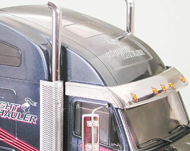 About the Tractor Truck Knight Hauler This 1/14 scale R/C Tractor Trucks Item features an originally designed truck body. Hood, large roof spoiler, interior, and lights (clear orange parts), which have been artistically rendered in exquisite detail. Grill, tank, exhaust and steps have been beautifully rendered with metal plated parts. Kit includes stickers and 540 motor. 7.2V battery pack and R/C system are sold separately.