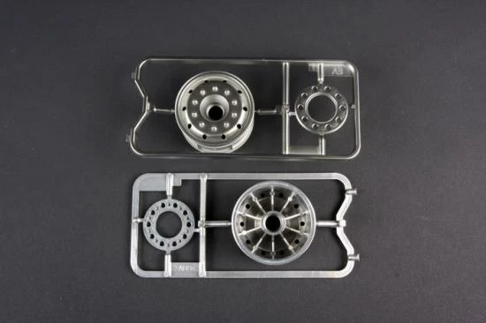 Actual tractor trucks are often seen with plain natural-metal wheels made of steel or aluminum. To depict this type of wheel, these matte finish metal-plated wheels for 1/14 scale R/C tractor trucks and semi-trailers are available as an option accessory. By simply replacing with kit-standard gloss finish metal-plated wheels, you can give your truck or trailer a different appearance.